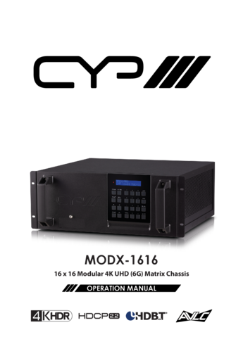 A fully customizable 16 x 16 modular matrix switcher, CYP's flagship product, capable of handling 4K UHD signals at 18 Gbps (4:4:4 @ 60 Hz) with HDR10 and Dolby Vision support. Thanks to its modular structure, it can accommodate up to 4 input cards and 4 output cards, each with 4 ports, enabling flexible and scalable configurations for high-end professional installations.