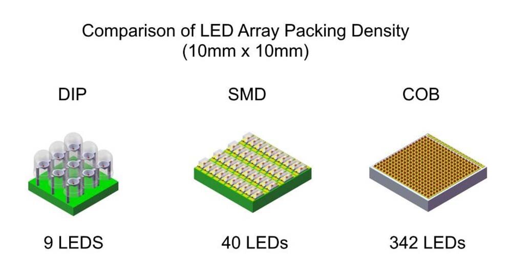 L’ immagine seguente mostra, a parità di superficie, la differente scala d’integrazione fra i LED DIP (Dual In-line Package), basati sulla già citata tecnologia THT dove due file di pin vengono inseriti nei fori di un circuito stampato e saldati sul lato opposto, e gli SMD / COB.