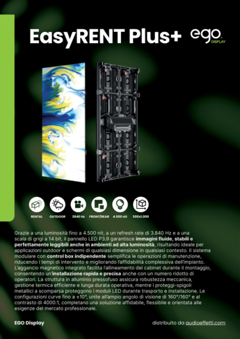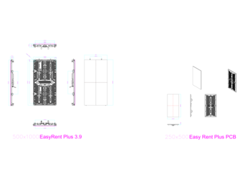 La nuova versione del noto pannello LED P3.9 per applicazioni outdoor (4500 - 5000 nit di luminosità dopo la calibrazione) a sviluppo verticale con cabinet da 500 x 1000 mm, che accoglie 4 moduli quadrati da 250 x 500 mm. La risoluzione di un singolo modulo è di 64 x 128 pixel, quella dell'intero cabinet di 128 x 256 pixel.