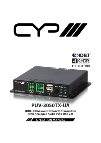 PUV‑3050UA‑KIT è un extender HDBaseT 3.0 di nuova generazione, costituito dalla coppia PUV-3050TX-UA (trasmettitore) e PUV-3050RX-UA (ricevitore), progettato per trasmettere segnali HDMI 2.0 non compressi fino a 4K @ 60 4:4:4, audio HD e segnali di controllo su un singolo cavo Cat.6a/7 fino a 40 metri.