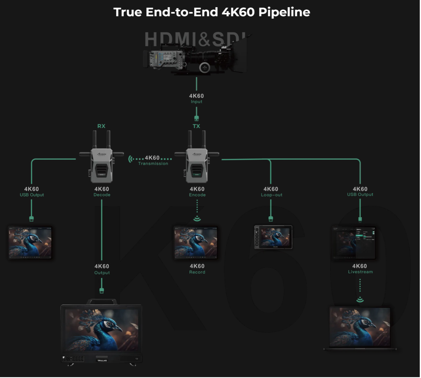 Il ricevitore mantiene la stessa flessibilità, con le uscite HDMI 2.0 e SDI 3G, garantendo compatibilità con monitor da regia, switcher e sistemi di registrazione.