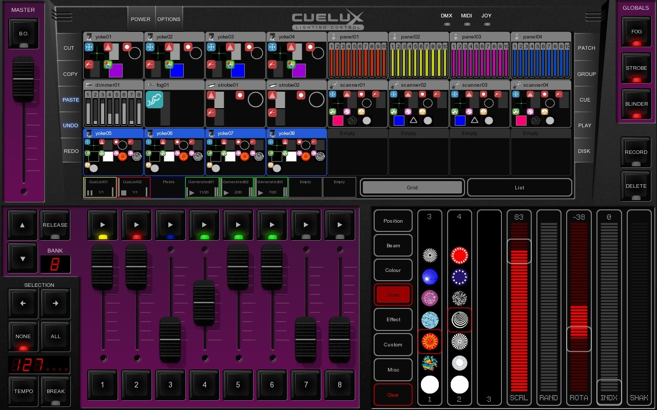 La gamma è arricchita da software dedicati come Cuelux e CueluxPro, pensati per programmare e gestire show luci da PC, e da interfacce touchscreen come KioscTouch2, che permette di creare pannelli grafici personalizzati per il controllo diretto dell’impianto di illuminazione dinamica. L’insieme di hardware e software costituisce un sistema completo, compatto e facilmente scalabile.