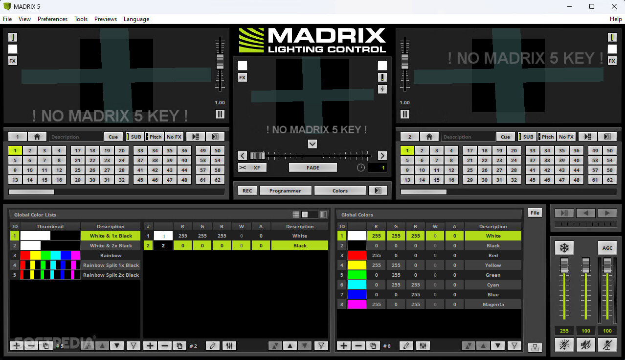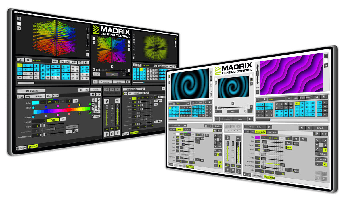 Grazie alla sua piattaforma avanzata e a una serie di strumenti hardware dedicati, MADRIX è in grado di gestire e animare con grafiche video sia le più semplici strip LED, sia i progetti scenografici 3D più ambiziosi, mantenendo un approccio intuitivo nella programmazione. La sua forza risiede appunto nella capacità di controllare fixture LED di ogni tipo, gestire grandi quantità di dati DMX / Art-Net e integrarsi con audio e video (NDI, Spout), permettendo effetti dinamici in tempo reale e gestione remota, anche in modalità stand-alone tramite dispositivi come MADRIX AURA. Il software può essere utilizzato anche in versione demo senza licenza, ma con limitazioni significative: per attivare le uscite DMX o DVI è sempre necessaria una licenza (tra le sei disponibili, con possibilità di upgrade progressivo).