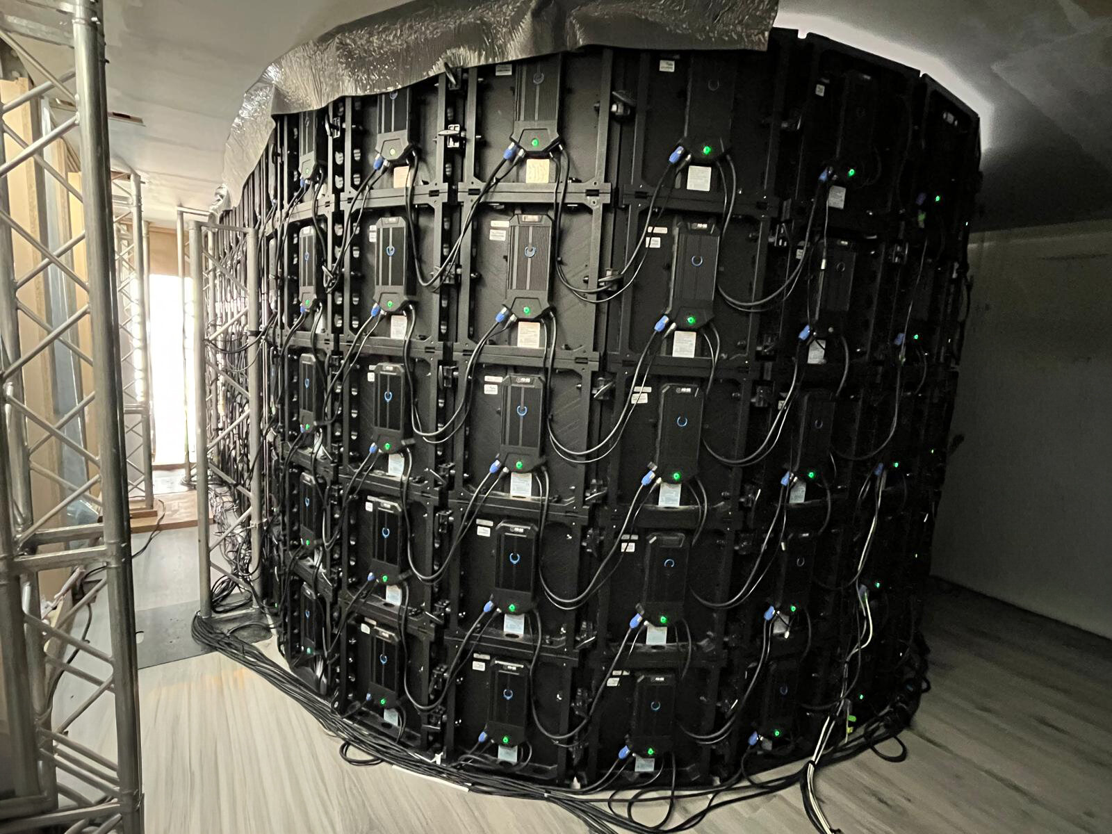 I connettori curving con opzione da 15° tra un modulo e l’altro hanno permesso di ottenere la curvatura concava richiesta mantenendo rigidità strutturale e perfetta continuità dell’immagine.