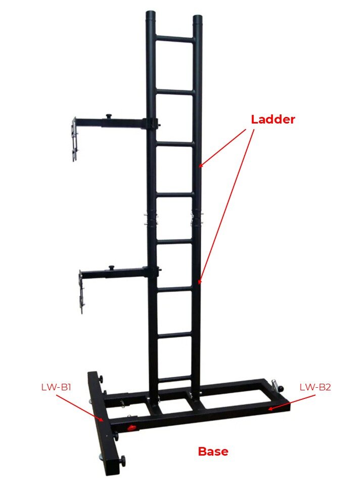 Le ladder vengono installate su una robusta base in acciaio, composta da una sezione anteriore con stabilizzatori regolabili, disponibile in due larghezze (LW-B05 da 50 cm e LW-B1 da 1 m), e una sezione posteriore (LW-B2) dotata di mandrino di livellamento, che consente di compensare eventuali irregolarità del pavimento con estrema precisione. Le due sezioni sono ortogonali fra loro.